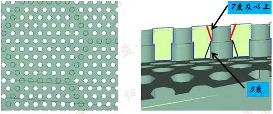 汽車件中,網(wǎng)孔的形狀有很多種,目前常用的有圓的和六角的,圓的直接用石墨電極加工,六角的電極要專業(yè)的廠家做,電極的價(jià)格也比較昂貴的。然后再在火花機(jī)上加工,一般有面都會(huì)有皮紋要求,首選火花機(jī)為沙迪克,網(wǎng)孔的定模出模角度要做到7度及以上,動(dòng)模最少要5度。